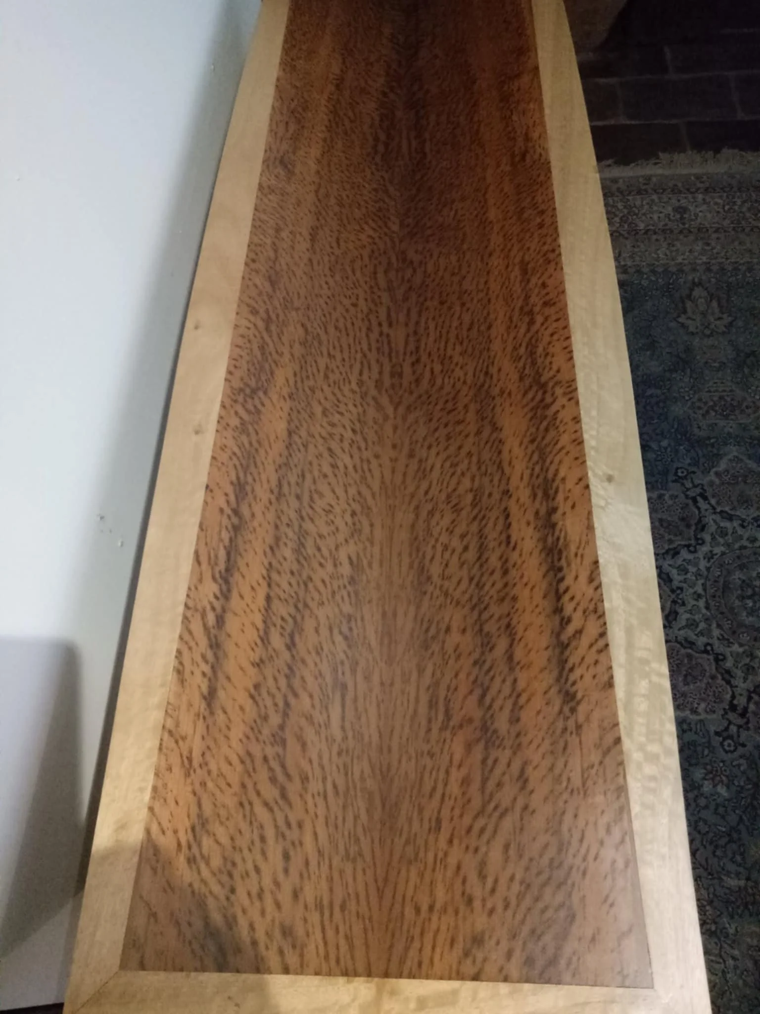 Low Hall Table in French Oak and Curly Blackbutt wood.