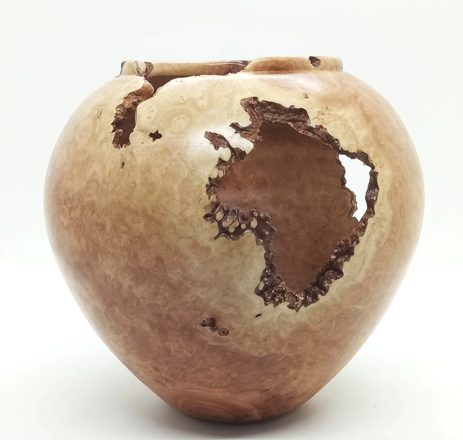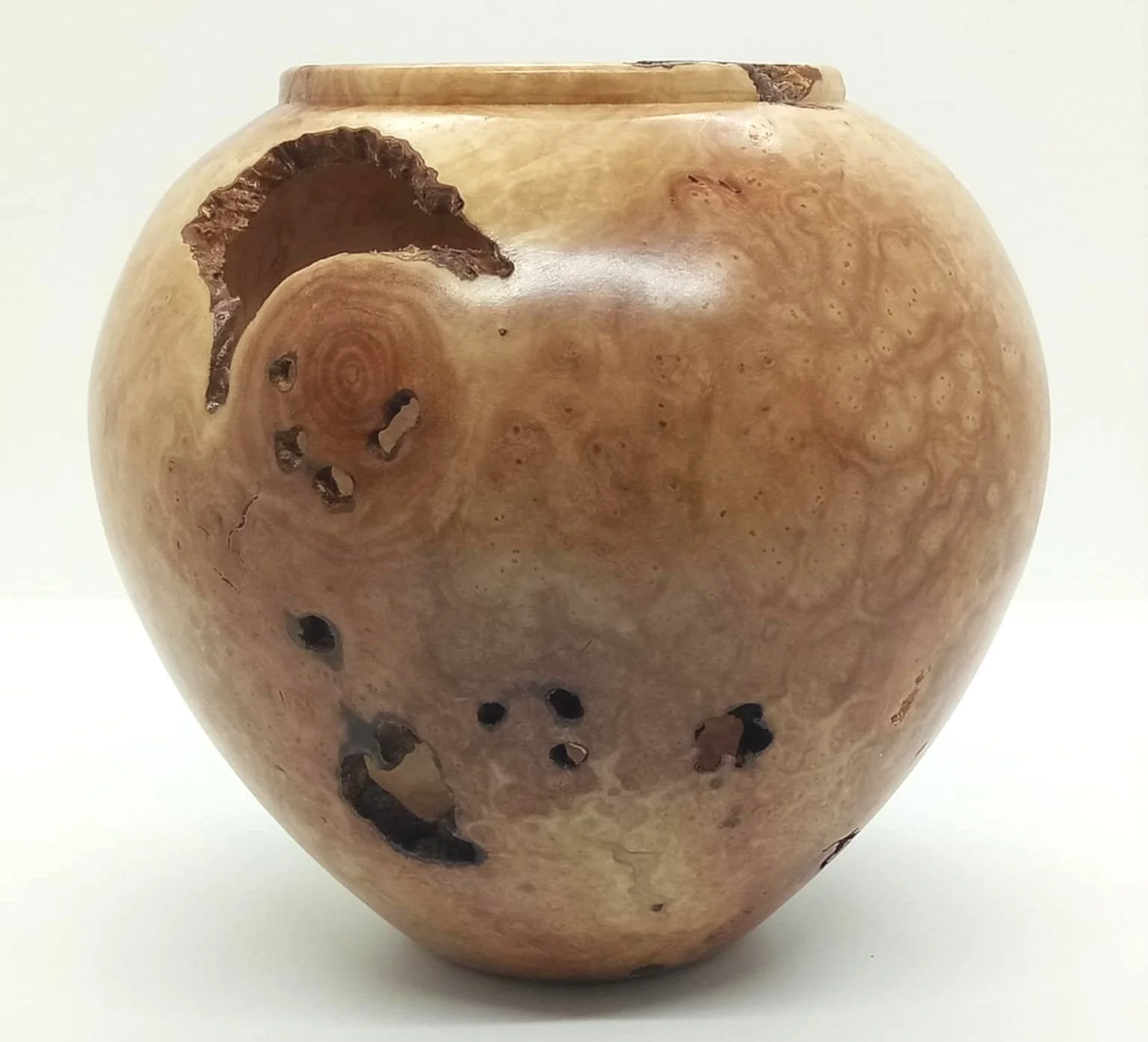 "Grecian Urn" A fortunate save with this lovely piece of Huon with its bark inclusion threatening to split the piece in two. Plenty of duct tape and steel rigs used during the hollowing process